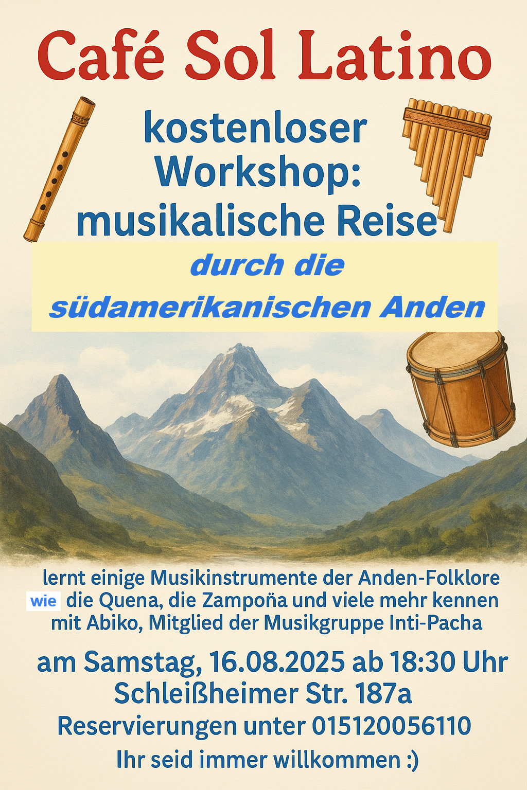 Café Sol Latino veranstaltet kulturelle Feste, in denen lateinamerikanische Musik- und Tanzgruppen auftreten. Unser Ziel besteht darin, durch traditionelle Musik und Tänze die Kultur der verschiedenen Länder Lateinamerikas vorzustellen und zu verbreiten. In unseren Festen bieten wir außerdem typische Gerichte der regionalen Küche an.
